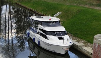 Człowiek z biura podróży, który go przywiózł nie miał problemu ze znalezieniem nas, choć byliśmy umówieni tylko ogólnikowo w okolicy śluzy. Jesteśmy jednak jedyną łódką w okolicy. I z tego co usłyszeliśmy jedną z niewielu w sezonie. Czujemy się wyjątkowo, ale też towarzyszy nam nutka żalu, że tak ciekawy obiekt jest tak rzadko oglądany i wykorzystywany.